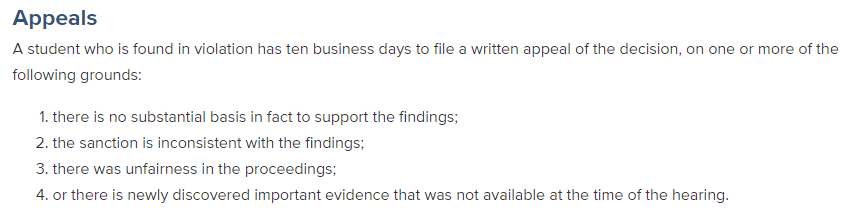 对听证会的决定进行的申诉,学生仍然有申诉的权利。学生必须在收到判罚决定的10天内提交书面申诉。申诉需要基于以下几种理由: