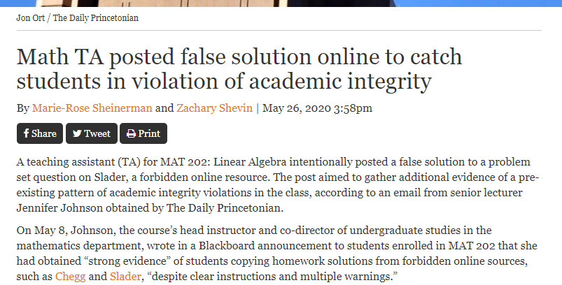 The Daily Princetonian(《普林斯顿日报》是普林斯顿大学的独立日报)一则新闻让人惊了……一节数学课的TA将错误解题方法放到了学校禁止使用的在线学习资源网站上,于是21个学生copy了这个错误解题答案,被老师举报学术不诚信。学校老师说,尽管多次强调警告不可以复制网上的答案来解决家庭作业,但是依然有人违反规定。