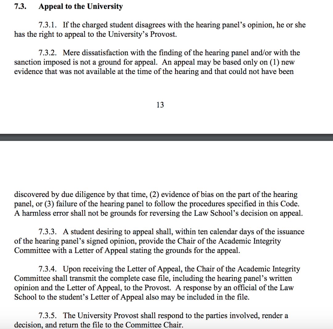 在听证会结束之后,委员会会尽可能快地作出决定。如果委员会有合理的证据认为该学生的确违反了学校的学术诚信要求,则会通过书面的形式将处分结果告诉学生。如果学生不同意听证会的决定,可以向University Provost提出进一步申诉。申诉的根据需为学生有新的证据能够提供或是听证会有程序错误。学生需要在听证会结果出来之后十天内提交申诉信进行申诉。