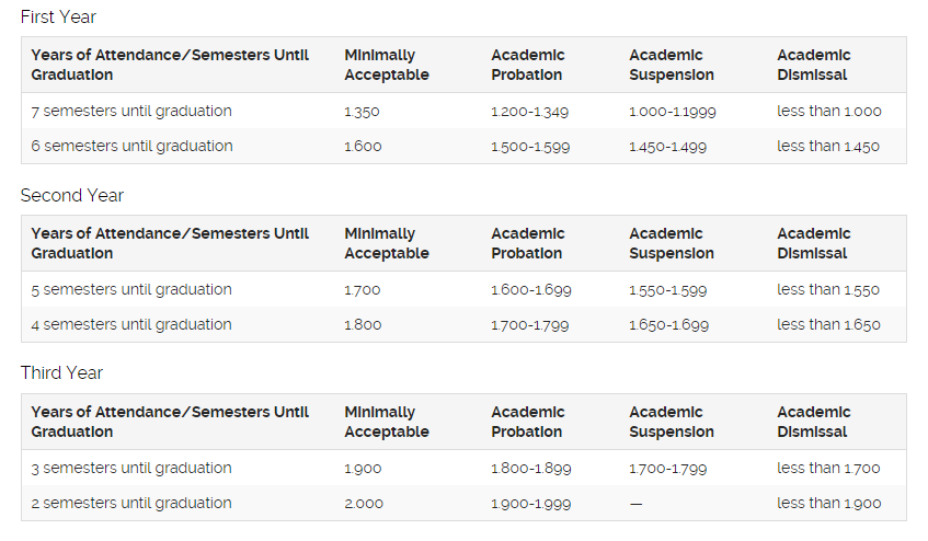 当学生无法满足学校规定的最低成绩时,将面临学校给予的学术警告或留校察看(Academic Probation)处罚,严重的还将面临停学(Academic Suspension)或者开除(Academic Dismissal)的危险。学校给出的具体GPA要求如下: