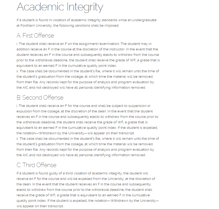 对于福特汉姆大学来说,学术诚信至关重要。学校致力于培养学生的学术诚信意识,要求学生必须在诚实方面保持最高道德标准。福特汉姆大学对于学术不诚信的定义,包括但不限于:Plagiarism、Cheating、Falsification、Unapproved Collaboration、Other Violations of Academic Integrity。