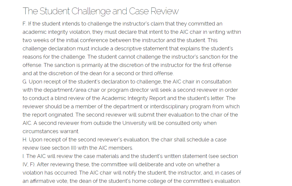 当教师怀疑学生有学术不诚信行为时,将会根据学校的学术诚信政策与学生安排面谈,讨论涉嫌违规的内容和可能的处分。同时,教师需要上报学校并附上相应的证据。如果教师与学生就事情的真实性和处罚达成一致,则表明学生承认违反了学术诚信政策并接受处罚,同时学生也放弃了申诉的权利。如果双方无法达成一致,学生必须在与教师面谈后的两周内以书面形式向the Academic Integrity Committee (AIC)提出正式调查。在收到学生的上诉后,AIC主席和学院主席会选取相关负责人来审理案件,并作出相应的判罚。