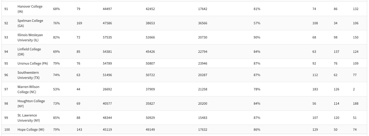 第一名是阿默斯特学院、第二名是卫斯理大学、第三名是伯利亚学院;《华盛顿月刊》把伯利亚学院排在第三位,因为提供低学费的优质教育,为低收入家庭的孩子获得高等教育提供了良好的机会。