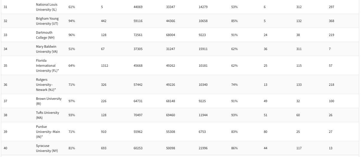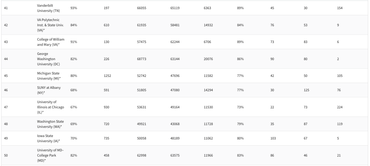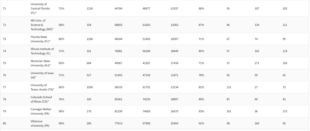 其实很多大家的私立“梦校”都在这份榜单中排名非常靠后。比如USC的排名是53名,Emory是63名,华大圣路易斯是64名,维克森林是70名,CMU甚至排到了第79名。