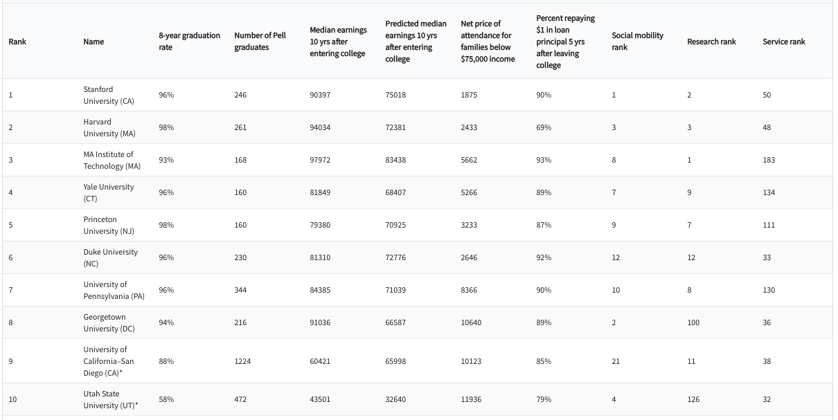 第10名则是犹他州立大学,比去年前进了4名。而在US News排行榜中,它仅位列第254名。