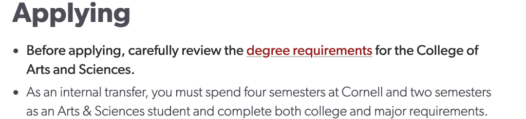 康奈尔大学的文理学院则对于转学院的时间没有明确要求,但是要求学生的至少最后四个学期要在文理学院就读。