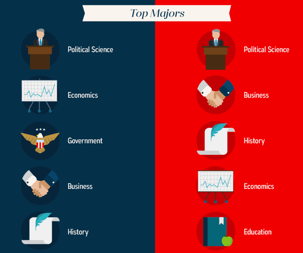 我们从当前的美国国会(按党派划分)官员的学历专业入手进行搜索,不难发现美国的从政人员的大学专业非常相似:政治学,政府,经济学,商业和历史是最常见的学位选择。