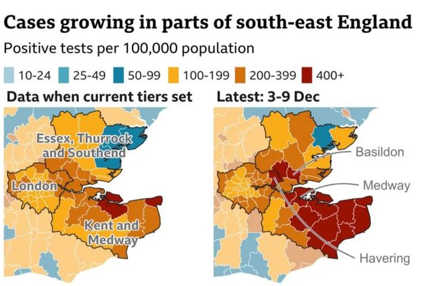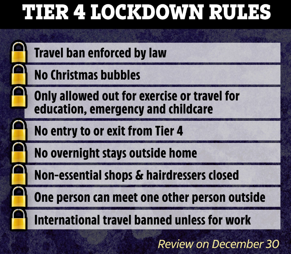 因此英国政府决定从12月20日上午开始,在首都伦敦以及英格兰东南部和英格兰东部的部分地区开始实施最高级别“4级”的封锁限制。