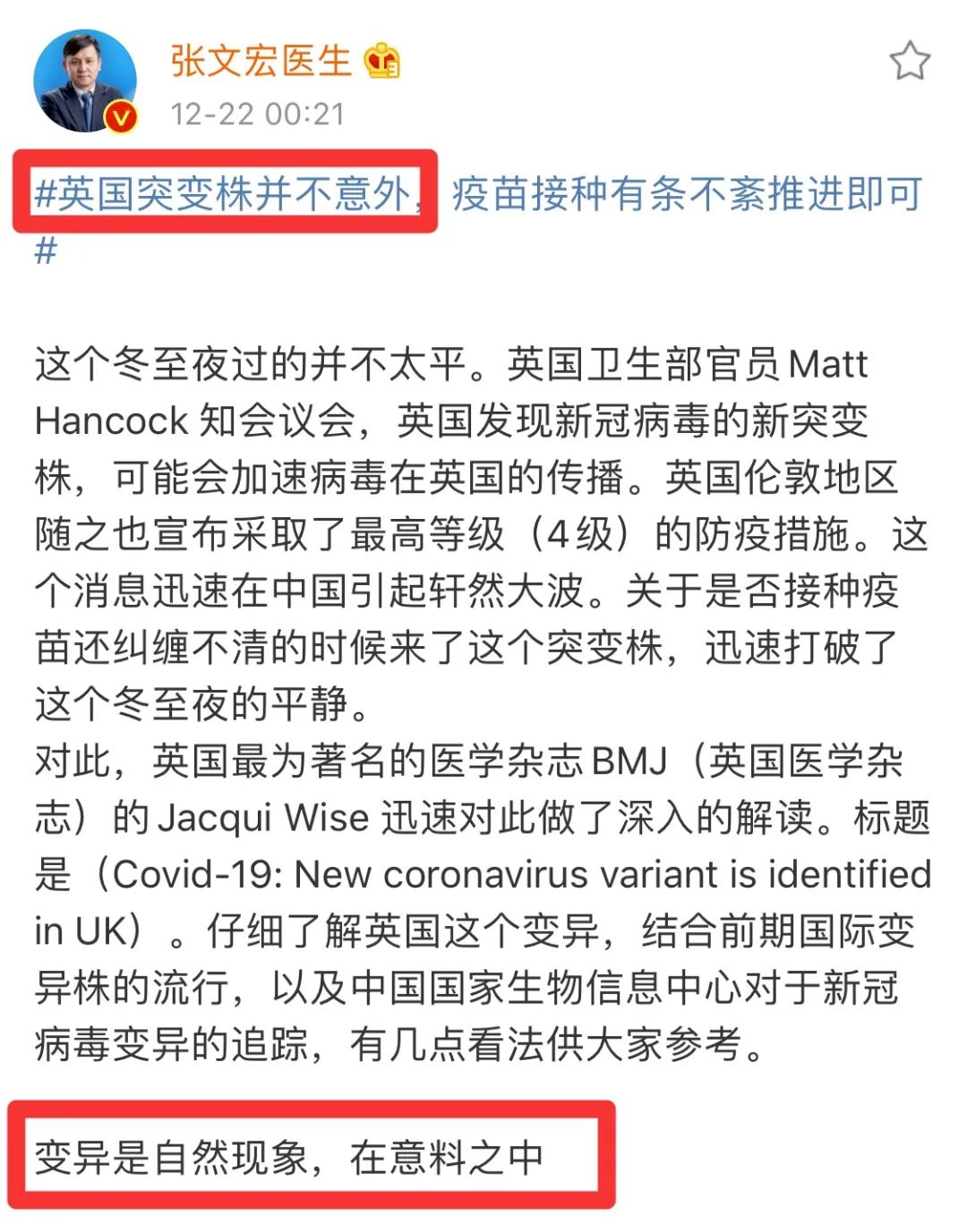 张文宏医生也在今天凌晨发表了观点中也提到「英国突变株并不意外」「变异是自然现象,在意料之中」。