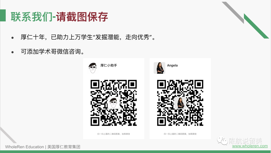 感谢各位家长同学观看上周《让孩子留美成功的教育方法论FITS解读》讲座,本次讲座特邀请厚仁资深规划师Angela老师,首次深入解析学生成功背后的厚仁方法论FITS,理论基础和实践经验。不论你是否是厚仁的学生家长,了解行之有效的教育方法论,都会对你的留美过程和结果有益。