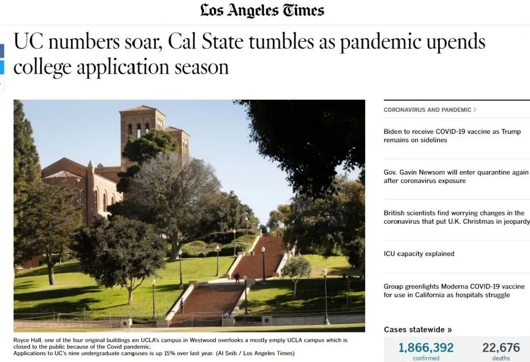 近日,加州大学招生办主任Michael V. Drake跟《纽约时报》披露了初步数据。今年,加州大学九所校园的申请量激增至25万,比去年增长了15%,创历史最高纪录!