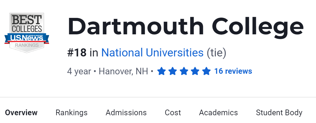 在2024年USNews美国大学排名中,达特茅斯学院排名第18。