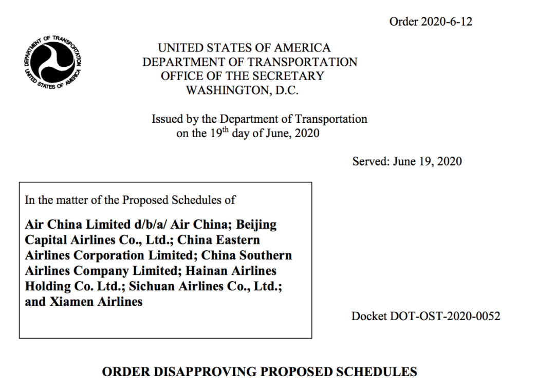 不过,据路透社报道,针对中国航司增加航线的要求,美国时间6月19日,美国交通部发布命令表示:暂不批准中国现有4班航班以外的其他航班计划,仅限目前运营的一周四趟航班。