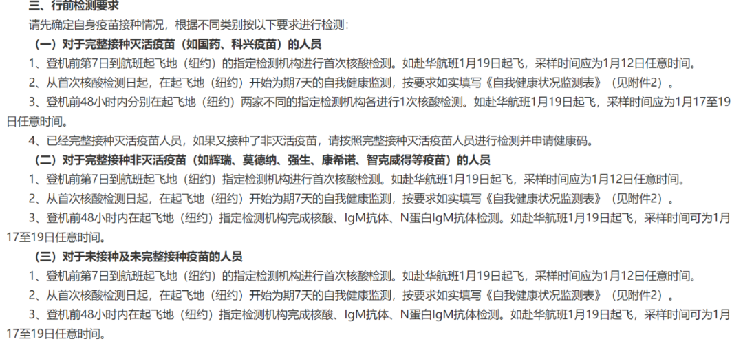 2022年1月13日(含)及此后乘自纽约直飞赴华航班的旅客需要遵照执行