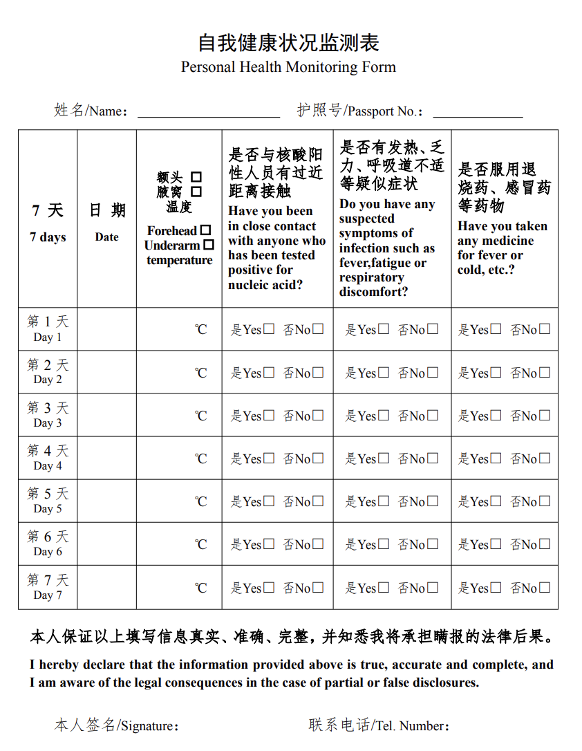 2、从首次核酸检测日起,在起飞地(纽约)开始为期7天的自我健康监测,并填写监测表。