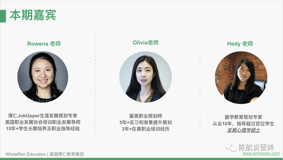 感谢各位家长同学观看上周六的《如何合理有效准备申请季:申请倒推方法论解读》讲座,本次讲座的特邀嘉宾李欢老师和Olivia老师是职尚行的生涯发展规划专家,Hedy老师是留学教育规划专家。四位嘉宾携手,为大家从倒推方法论解读有效准备申请季的几个步骤。