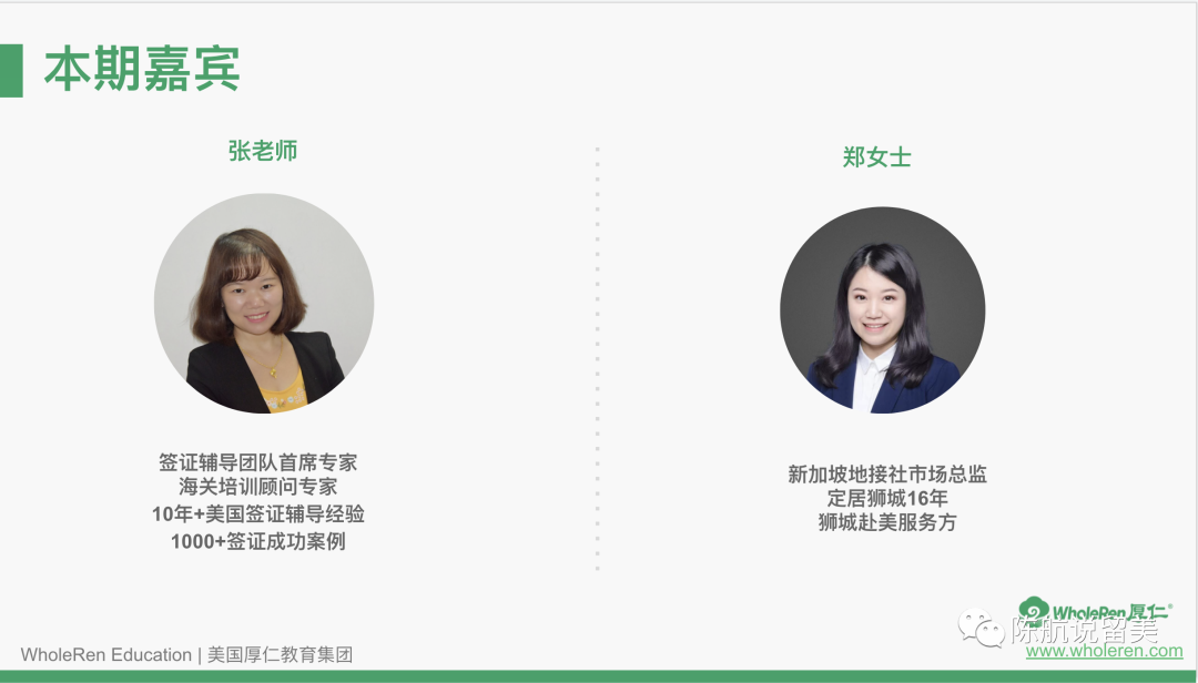 感谢各位家长同学观看周六的《最新留学生返美3大政策变化解读》讲座,本次讲座的特邀嘉宾张老师是厚仁签证中心的专家,两位老师携手新加坡地接市场总监郑女士,一同为大家讲解最新留学生返美的3个政策变动。