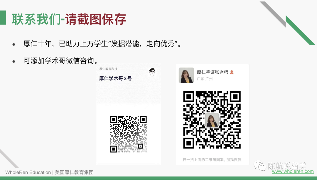 感谢各位家长同学观看5月29日的《赴美签证政策更新解读》讲座,本次讲座的特邀嘉宾张老师是厚仁签证中心的专家,两位老师携手,为大家解读签证政策相关更新,助留学生理清现状,更好准备赴美签证。