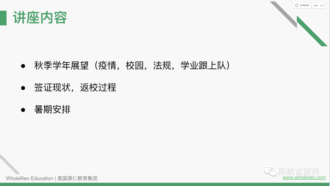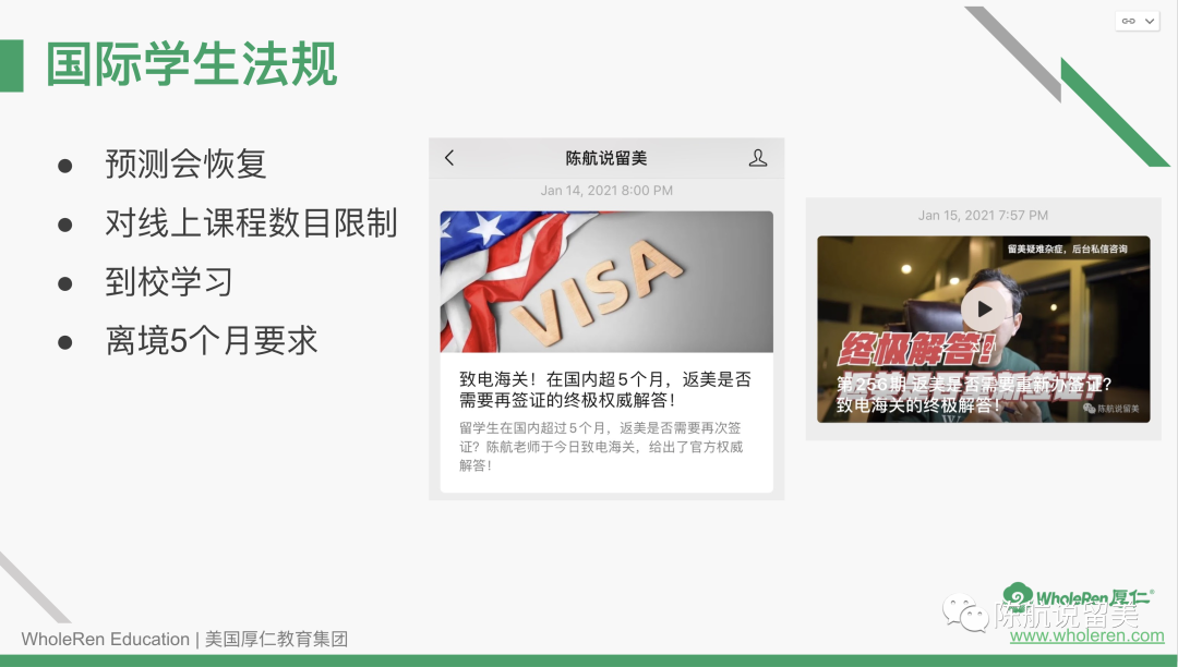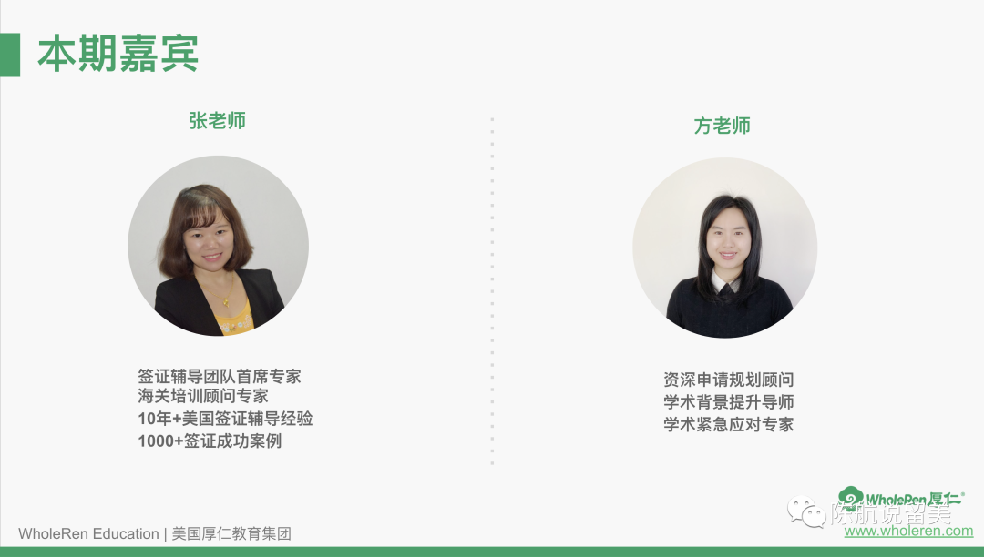 感谢各位家长同学观看上周六的《2021-22学年预测和返校危机》讲座,本次讲座的特邀嘉宾张老师是厚仁签证/海关辅导专家,方老师是资深申请规划专家。三位嘉宾携手,为大家解读2021-2022美国留学预测和返校危机。