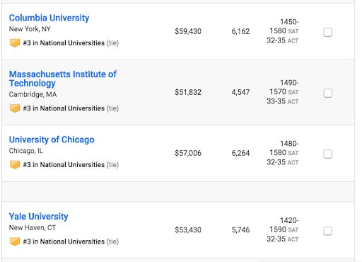 这个表格,是以美本精排榜的前50名,以及几所典型的50以外的大学为例进行分析。