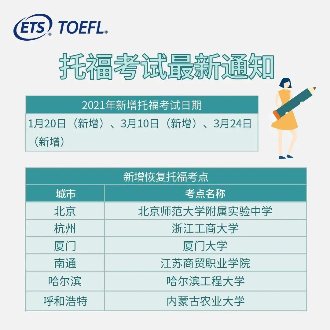 这里也给大家提供一下 2021 年最新的托福考试时间及考点安排,记得要早点规划起来哦~