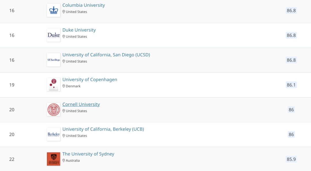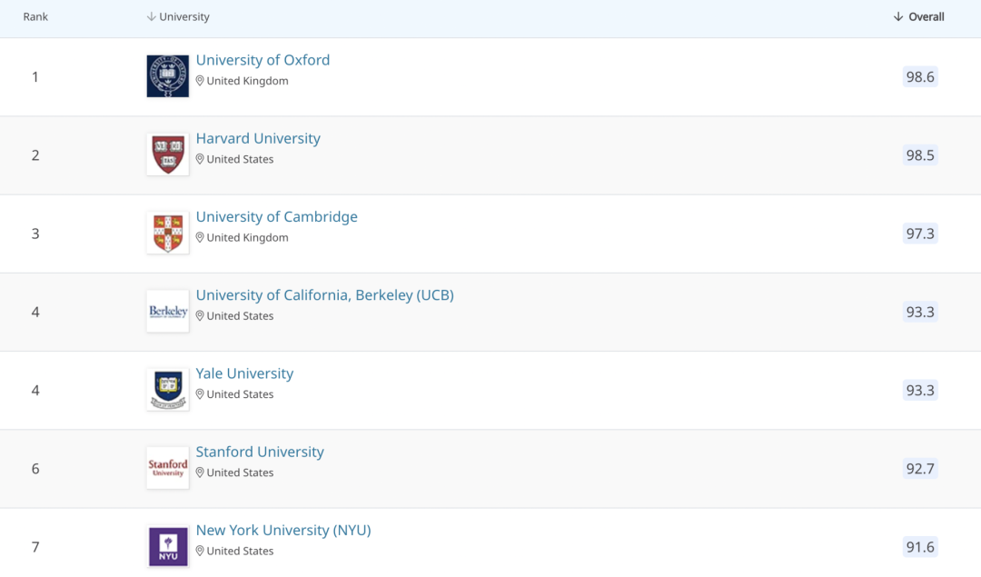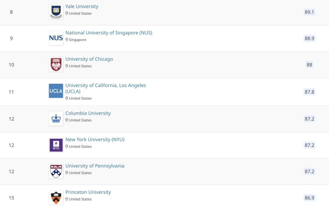 综合学科排名考量了学校在社会科学与管理、艺术与人文、生命科学与医学、工程技术等五大专业中的水平。我们熟悉的UCLA、UC Berkeley、斯坦福、MIT、哈佛等大学都在排行榜中取得了优秀的名次。