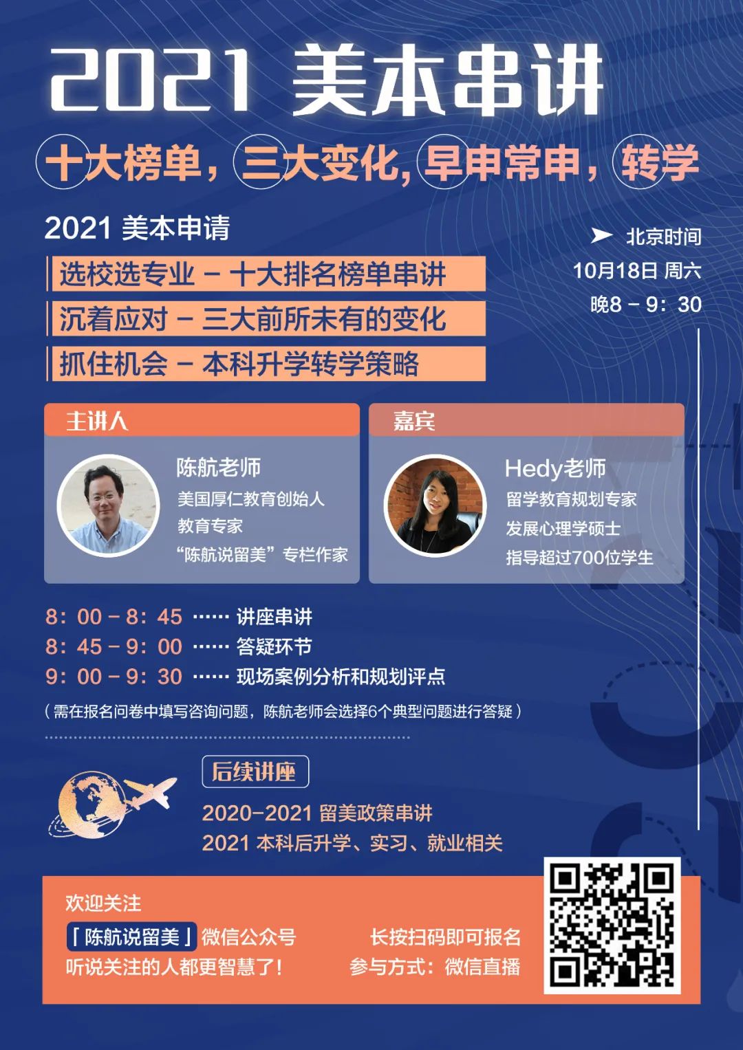 👨有以上疑问的朋友,千万不要错过厚仁教育创始人陈航老师的《2021 美本串讲》讲座,陈航老师被誉为“排名学专家”,本次讲座将涵盖以下几个热门留学话题:择校十大榜单,美本申请申请三大变化,申请类型和本科转学。帮助学生更全面的了解2021年美本申请,不打无准备之仗!