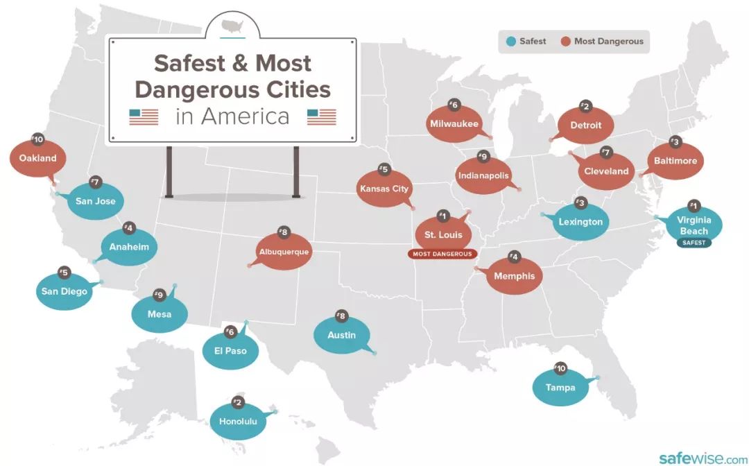 这个网址可以查看各州最安全和最危险的地区,相比上面这个地图,该网站给出了详细的数据及分析,非常具有参考意义,