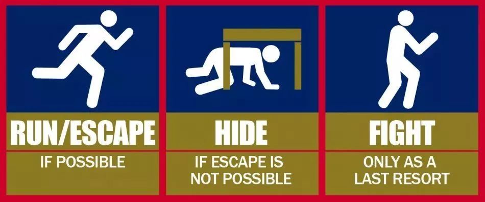 围绕三个重点:逃跑(run)、隐藏(hide)、反击(fight)
