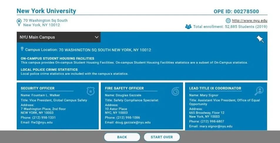 到了这里,所有的关于这个大学这个校区的安全信息就浏览完了,这个时候可以点击页面底部的Start Over,从头开始浏览别的校区的相关内容。