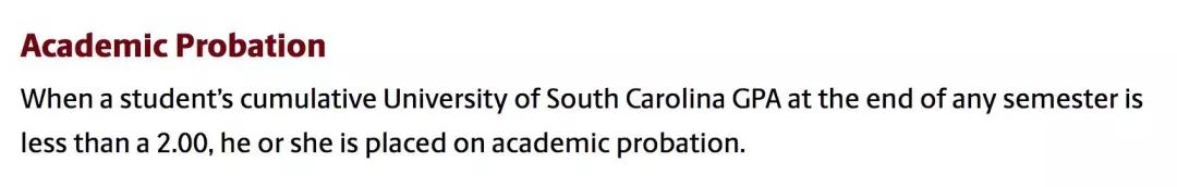 南卡罗莱纳大学学生可以继续学习的资格取决于良好的学术地位(Good Academic Standing),维持Good Standing 的最低标准是GPA不得低于2.0。当学生在任何一个学期的GPA低于2.0,将会被置于留校察看(Probation),直到学生在留校察看学期GPA达到2.0及以上才会取消处分。