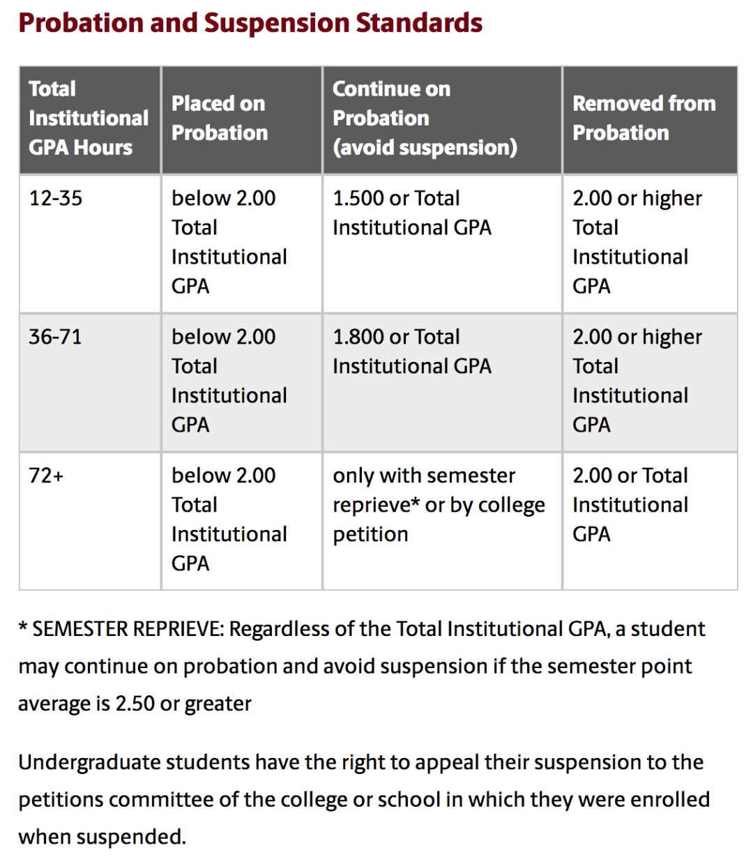 当学生被置于留校察看后,如果学生所修的学时在12-35之间,GPA高于1.5将继续被留校察看,低于1.5 将被停学(Suspension);如果学生所修的学时在36-71之间,GPA高于1.8将继续被留校察看,低于1.8将被停学;如果学生所修的学时高于72,将由学院决定处分。
