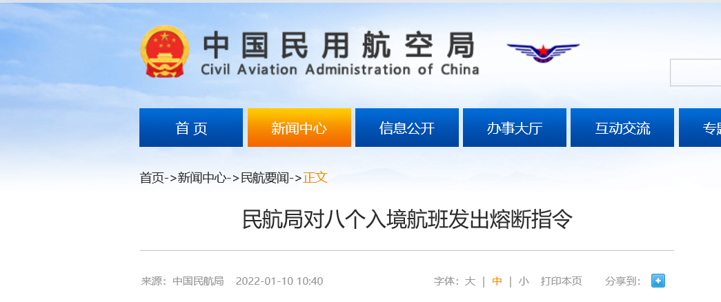 1月10日上午,中国民航局通报了对八个入境航班发出熔断的指令。