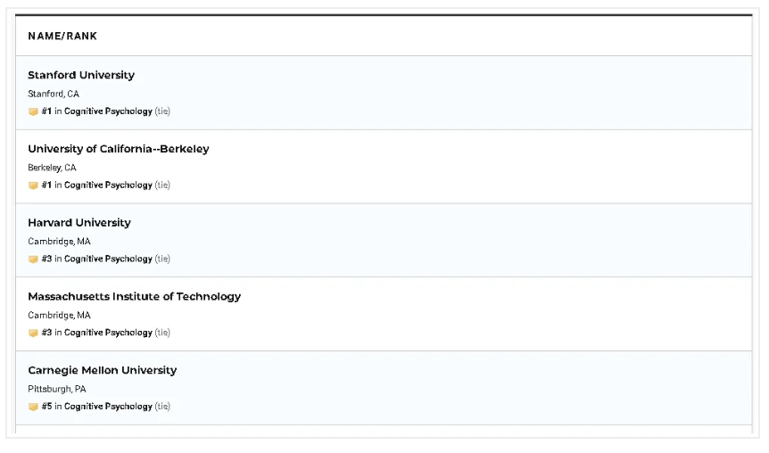 美国大学心理学专业的排名数据来源于两个方面:一是各研究生授予单位负责人和该领域内科学家的评价;二是各种统计指标,如教授的水平、研究情况、学生在入学时和毕业时的水平等。
