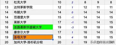 在前20里面,同去年相比,进步最大的是圣路易斯华大,从19名,进到16名,超过了康奈尔,圣母大学。