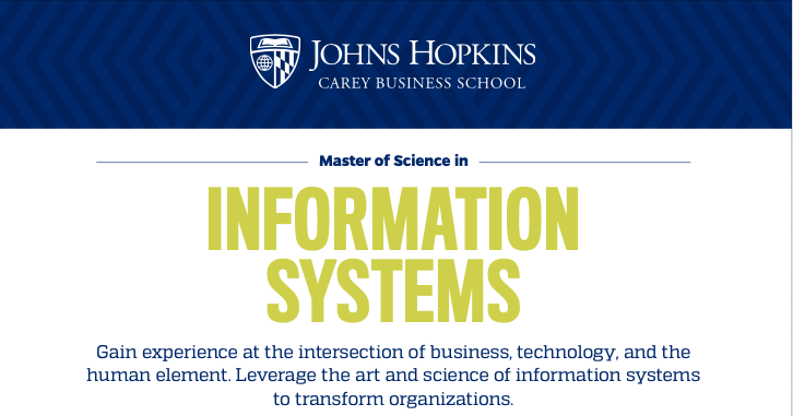上一篇介绍完约翰霍普金斯大学(JHU)凯里商学院的MSBARM(商业分析和风险管理科学硕士专业),一些家长说想再了解一些他们商学院的其他专业。那么今天我们就来讲一讲JHU另一个数据分析类热门硕士专业—— 信息系统科学(MSIS)。