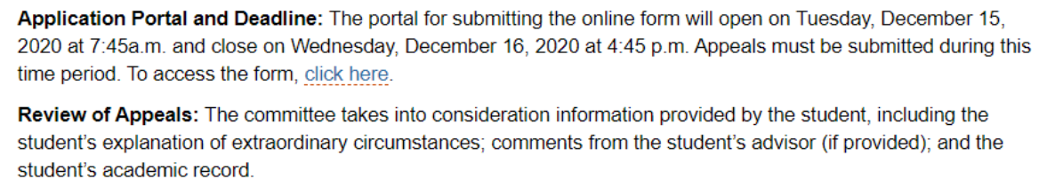 如果学生因为成绩差而受到suspension的处罚,学生可以向the Academic Appeals Committee提出申诉(appeal)来申请提前结束停学。如果想上诉,学生需要在规定的时间内提交书面申诉。学生应当特别注意申诉的时间,以免错过申诉的截止时间(具体时间要求见学校官网)。如果在 奥本大学申诉 成功,学生将可以继续留校学习,但是学术状态为academic warning。