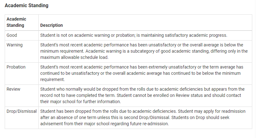 如果学生近期的学术成绩下降或没有达到上述GPA最低要求,将会被学术警告(Warning);如果学生最近的学习成绩非常不理想,学期GPA或者累积GPA低于2.0,将会被留校察看(Probation);如果留校察看的学生依然成绩不达标将会被学校审核(Review),审核期间学生不能注册课程,需要联系学院咨询进一步信息;成绩持续不佳的学生将会被 佐治亚理工学院开除 (Drop/Dismissal)。