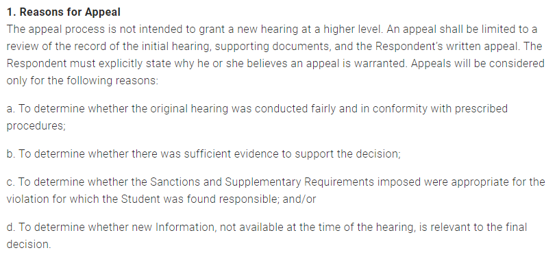 申诉程序并非旨在批准更高级别的新听证会。申诉仅限于对初次听证会记录、支持文件和被举报学生的书面上诉的审查。被举报学生必须明确说明他或她认为上诉有必要的原因。仅可出于以下原因才考虑上诉: