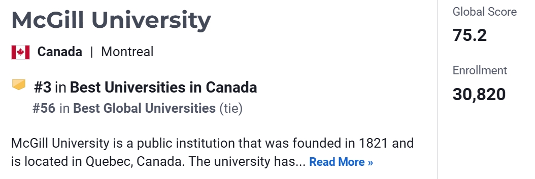 在2025USNews加拿大学校排名中位于第3名,世界大学排名中位于第56名。