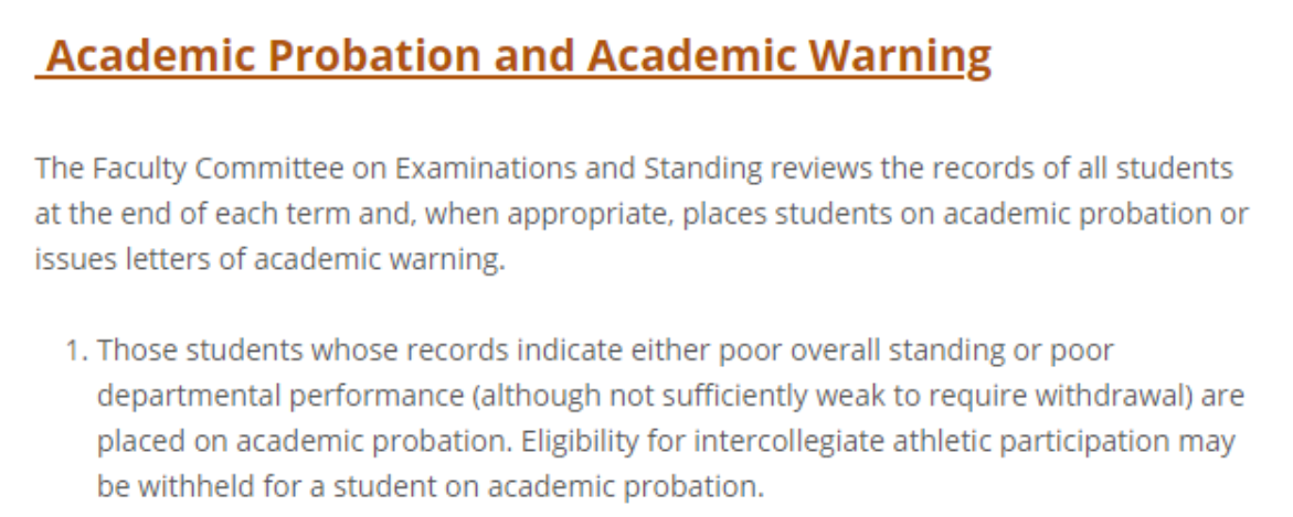 普林斯顿大学 对本科生的学习成绩GPA有严格的要求。除特殊情况外, 在校的本科生需要达到C或以上的成绩(GPA 2.0)才能够满足毕业的要求。如果学生在某一学期内连续取得两个D或以下的成绩,则会被认为成绩不达标而受到来自学校的警告和probation。当学生处于probation中,接下来学期的学术表现至关重要。如果在接下来的学期某门课程低于D或某两门课程低于C,则无法达标而会被 普林斯顿大学 要求 退学 (Required to withdraw)。
