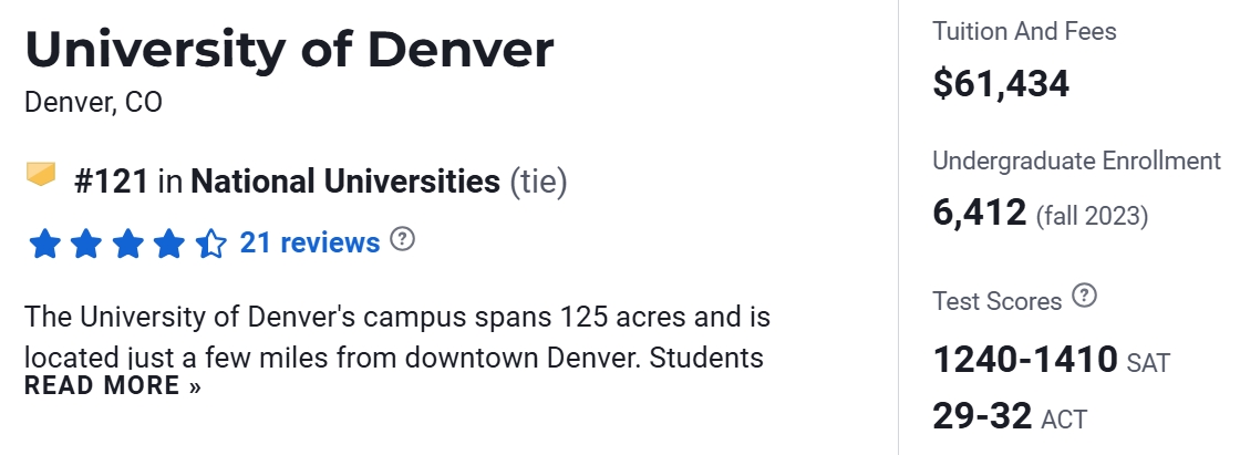 在2025 US News 美国大学排名中,University of Denver位于第121名。