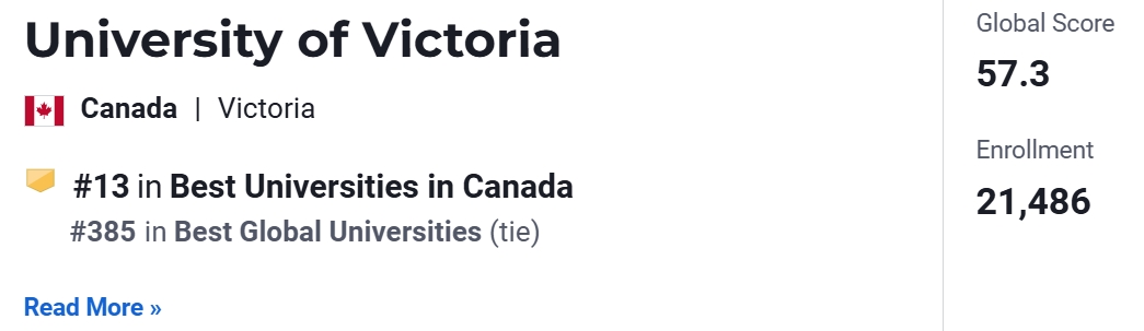 在2025 U.S. News加拿大大学排名中,University of Victoria第13位。
