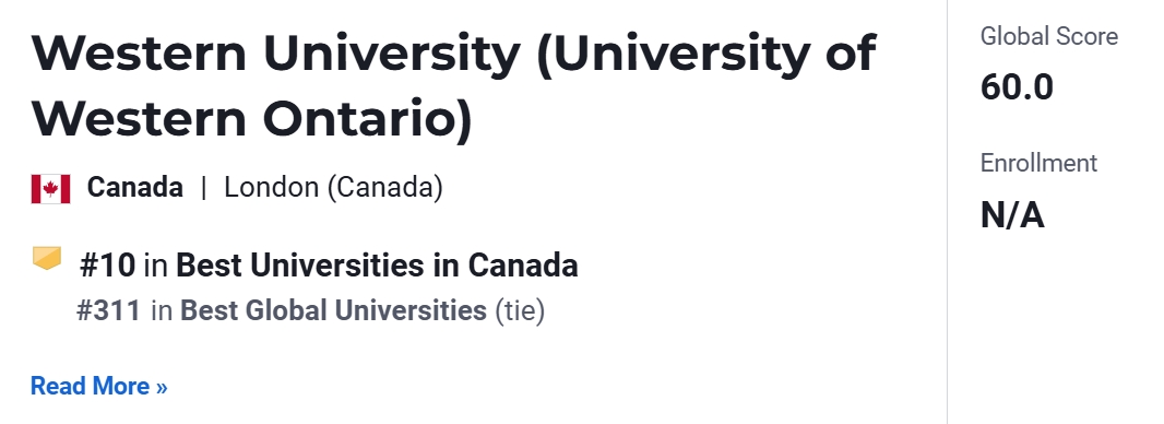 在2025U.S. News加拿大大学排名中,Western University第10位。