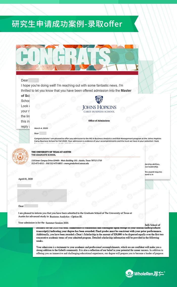 目前,S同学已获得全美排名第二的德克萨斯大学奥斯汀分校商业分析专业录取,以及约翰霍普金斯大学同专业$18,000美金奖学金录取。同时,为了日后就业考量而申请的福特汉姆大学及波士顿大学商业分析专业,也获得了offer。我们期待S同学更多的好消息!