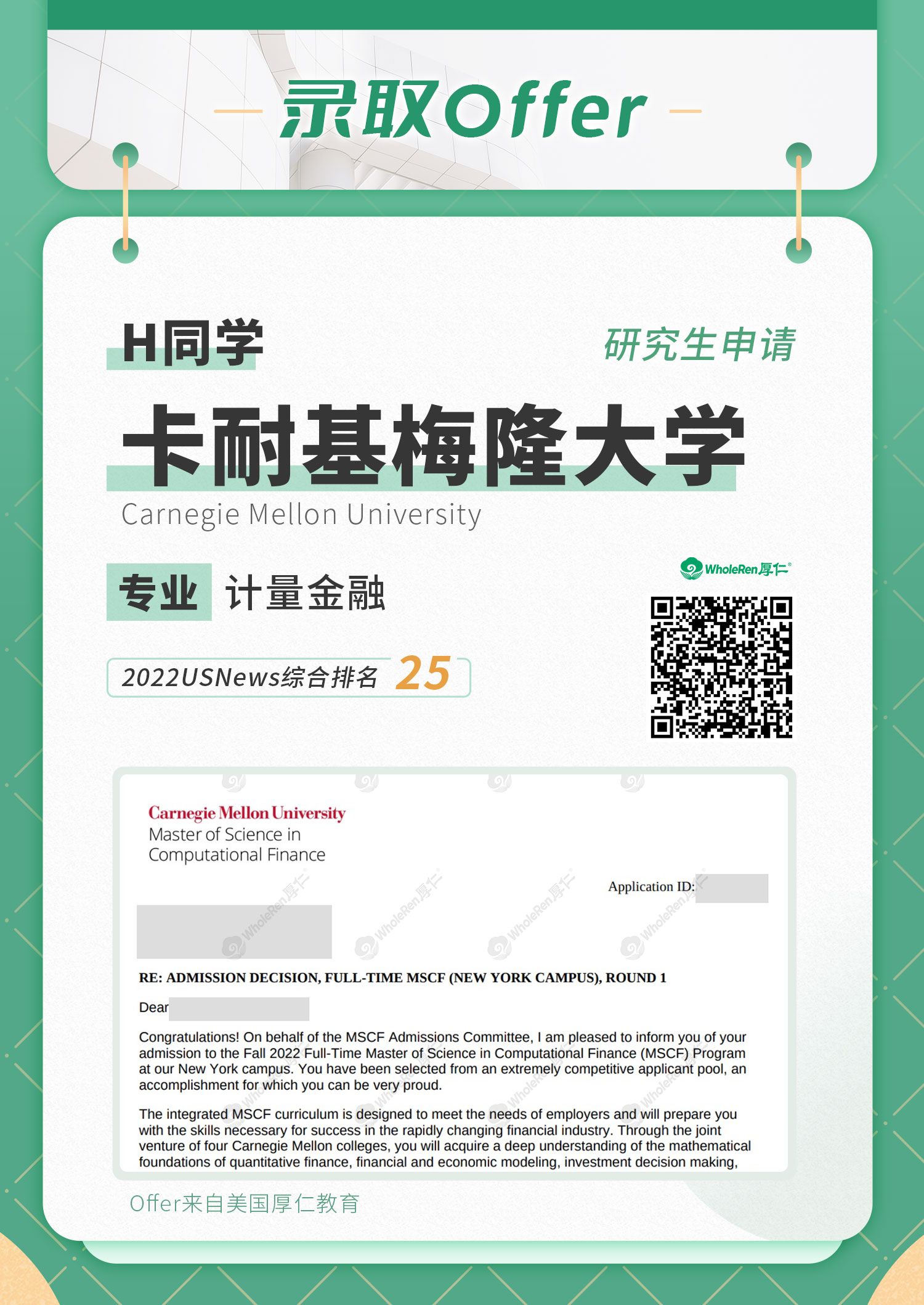 H同学就读于TOP25的美国大学,GPA4.0,GRE325+。个人申请优势十分明显,同时H同学对研究生的申请目标也十分明确,申请TOP 10院校。