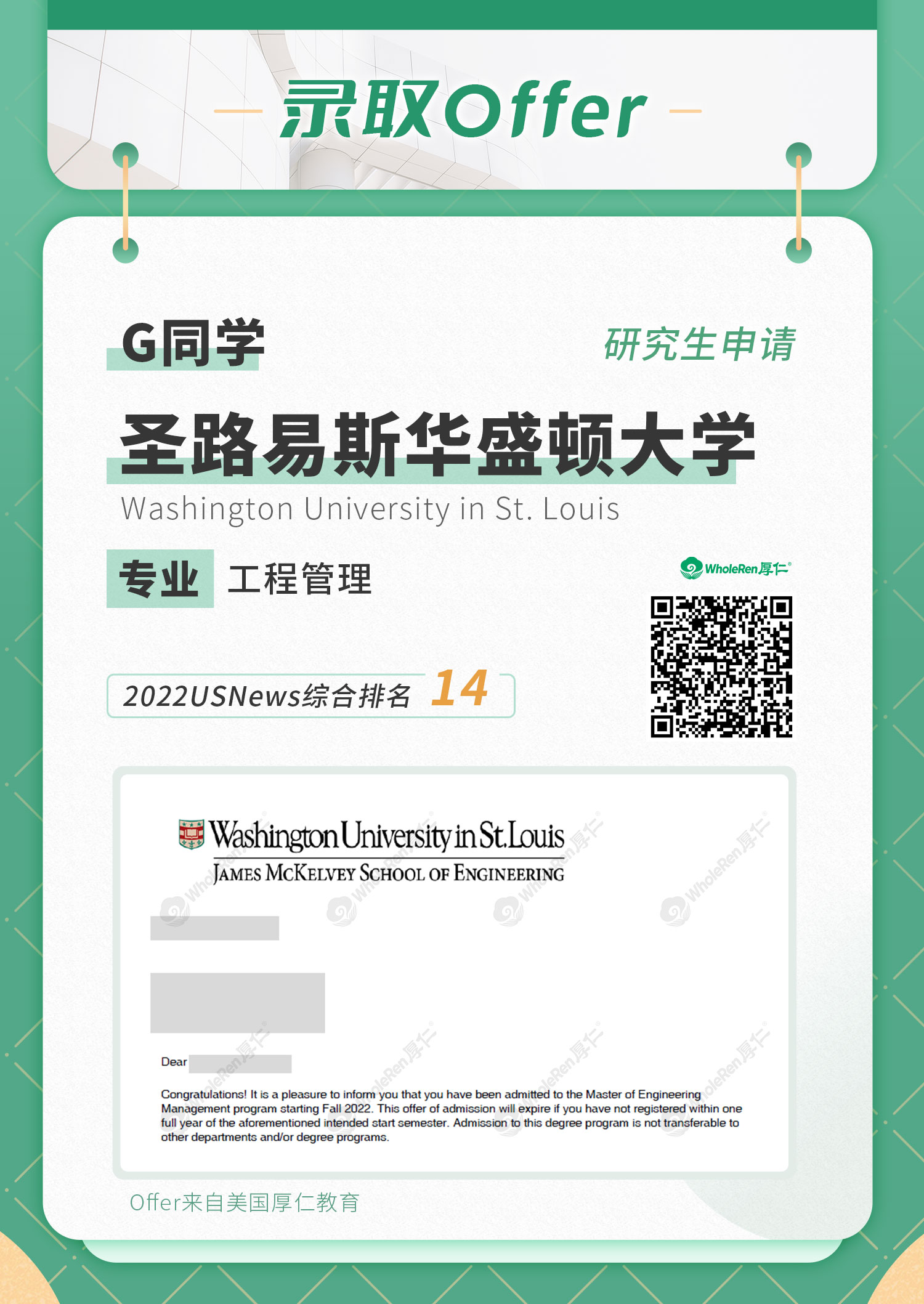 最后,G同学获得了排名14的圣路易斯华盛顿大学的录取offer,祝愿G同学未来学业之路一切顺利!