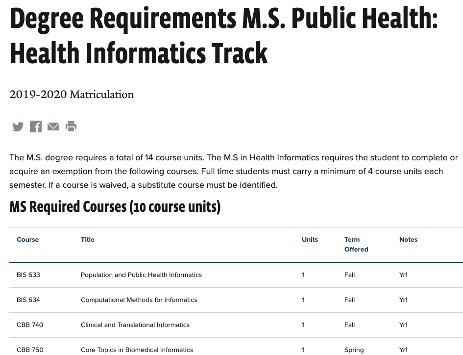 除了名气大,录取率相对可观以外,我挑出耶鲁MSHI健康信息硕士专业的另外一个原因,就在于这个专业本身的设置。它完美地体现了数据分析专业和健康管理行业的结合。让学信息技术的同学,将来有个更广的行业领域可以落脚。