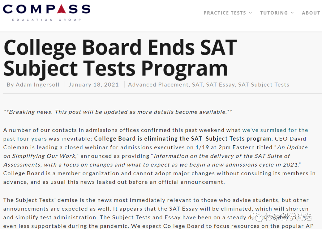 就在昨天,根据Compass最新报道,美国大学理事会(College Board,简称CB)正准备取消SAT考试科目和SAT作文考试,转而推广AP考试!