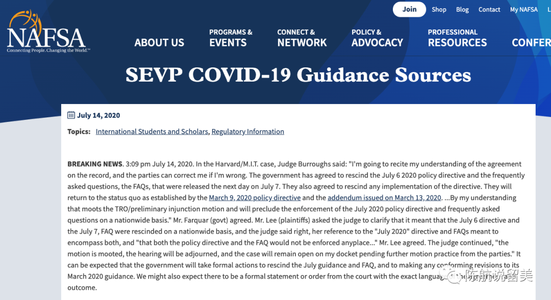 2020年7月14日下午3:09。在哈佛/M.I.T的诉讼中, Burroughs法官说:“我将重申我对记录中的协议的理解,如果我错了,各方可以纠正我。政府已同意废除2020年7月6日的政策指令,和7月7日发布的常见问题解答,他们还同意撤销该指令的所有实施,并将恢复到2020年3月9日政策指令和3月13日发布的附录所确定的现状。据我了解,该提案不涉及TRO /初步禁令,将阻止在全国范围内执行2020年7月的政策指令。”法夸尔先生(政府)对此表示同意。 李先生(原告)要求法官澄清说,这意味着在全国范围内废除了7月6日指令和7月7日常见问题解答。法官给予肯定答复,她提到“ 2020年7月”指令和常见问题解答意味着Lee先生同意“将政策指令和FAQ都不会在任何地方强制执行。”法官继续说:“动议尚待解决,听证会将押后,案件将继续留在我的案卷上,以待当事各方进一步动议。”可以预计,政府将采取正式行动,废除7月份的指南和常见问题解答,并对2020年3月的指南进行任何符合要求的修订。我们也可能希望法院以协议和结果的确切语言发布正式的声明或命令。
